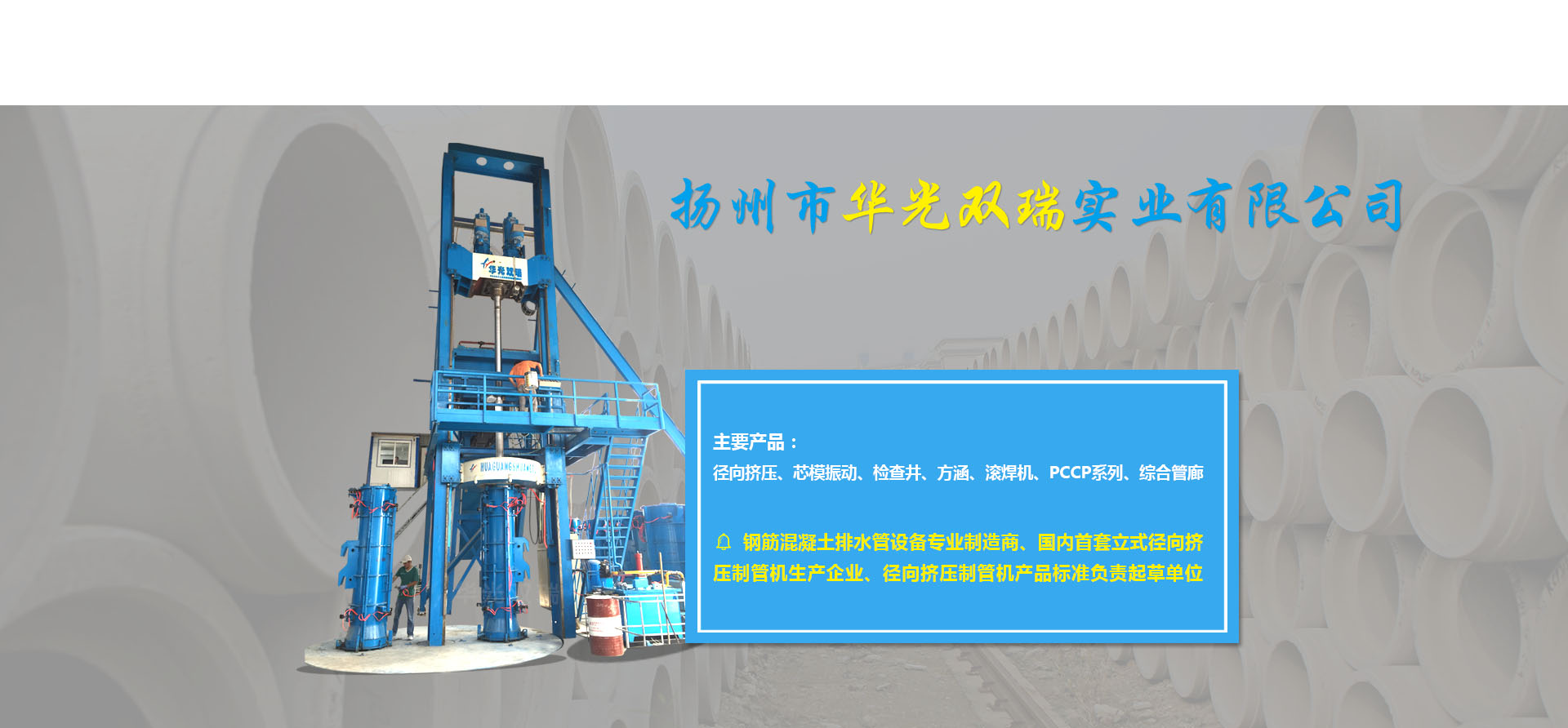 ????????揚(yáng)州市華光雙瑞實(shí)業(yè)有限公司,位于中國歷史文化名城揚(yáng)州市東郊江都區(qū)丁伙工業(yè)園區(qū),公司成立于2000年10月,是一家專門致力于鋼筋混凝土排水管生產(chǎn)裝備的設(shè)計(jì)開發(fā)、加工制造、銷售服務(wù)的專業(yè)制造商。公司2016年度被授予全國建材機(jī)械產(chǎn)品定點(diǎn)生產(chǎn)企業(yè),2017年度被授予中國混凝土與水泥制品協(xié)會(huì)會(huì)員單位,江蘇省認(rèn)定企業(yè)技術(shù)中心,江蘇省研究生工作站,揚(yáng)州市水泥制品工程技術(shù)研究中心,先后承擔(dān)過國家火炬計(jì)劃項(xiàng)目一項(xiàng),省科技項(xiàng)目二項(xiàng),揚(yáng)州市重點(diǎn)研發(fā)項(xiàng)目一項(xiàng)。公司擁有自主知識(shí)產(chǎn)權(quán)36項(xiàng)(發(fā)明專利6項(xiàng),實(shí)用新型專利30項(xiàng)),公司研發(fā)的13種產(chǎn)品榮獲江蘇省高新技術(shù)產(chǎn)品稱號(hào)。公司產(chǎn)品有立式徑向擠壓制管機(jī)系列、芯模振動(dòng)制管機(jī)系列、檢查井系列、方涵系列、自動(dòng)變徑滾焊機(jī)系列、PCCP系列、綜合管廊系列。核心產(chǎn)品立式徑向擠壓機(jī)2014年度榮獲混凝土與水泥制品行業(yè)技術(shù)革新一等獎(jiǎng),2015年度獲江蘇省機(jī)械工業(yè)科技進(jìn)步二等獎(jiǎng),2016年度獲全國建材行業(yè)技術(shù)革新一等獎(jiǎng),預(yù)制混凝土檢查井生產(chǎn)線榮獲混凝土與水泥制品行業(yè)2017年度技術(shù)革新二等獎(jiǎng),2011年度立式水泥制管成型機(jī)獲混凝土與水泥制品行業(yè)技術(shù)革新三等獎(jiǎng)。公司還是國內(nèi)首套立式徑向擠壓制管機(jī)的生產(chǎn)企業(yè),該產(chǎn)品2012年起填補(bǔ)了國內(nèi)同類產(chǎn)品的空白,公司2013年被國家建筑材料工業(yè)機(jī)械標(biāo)準(zhǔn)技術(shù)委員會(huì)批準(zhǔn)為《鋼筋混凝土排水管 芯模振動(dòng)制管機(jī)》《水泥制品用鋼筋混凝土管排水管鋼筋骨架滾焊機(jī)》的行業(yè)標(biāo)準(zhǔn)制定單位,2017年11月被國家建筑材料工業(yè)機(jī)械標(biāo)準(zhǔn)技術(shù)委員會(huì)批...